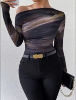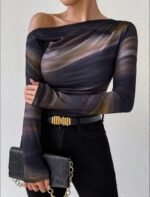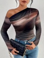 This is a stylish long-sleeve t-shirt with a unique one-shoulder design. It features an abstract pattern of brown, black, and white stripes. This versatile top is suitable for various casual occasions, offering a modern and attractive look.